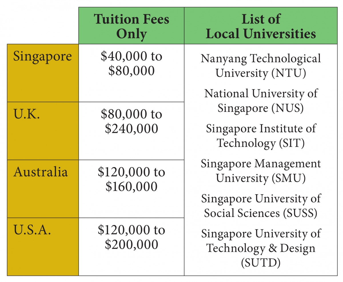 With 6 local universities providing courses in different fields, there is little need to venture overseas to get a tertiary education. The difference might just be an experiential one. Moreover, an overseas tertiary education cost several times more than a local university. With the internet, distance learning and twinning programmes have seen increasing popularity. Students need not travel so far to another country, spending extra money on lodging and food. Having an overseas degree also does not mean a higher starting salary. In fact, it takes longer to breakeven on education costs. Even though this is the case, there is a well-known saying that it is not what you know but who you know. Studying in prestigious schools may connect you personally to people in high places if you network diligently. Social media like LinkedIn are trying to replicate that but nothing beats a face-to-face communication. The table shows the approximate difference between local universities and overseas universities. Note that specialised courses like medicine and tuition fees of elite schools cost much more.